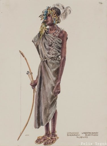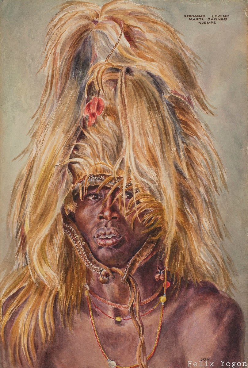 A Njemps warrior wearing a lion mane headdress, indicating his status. He holds a shield, spear and axe.